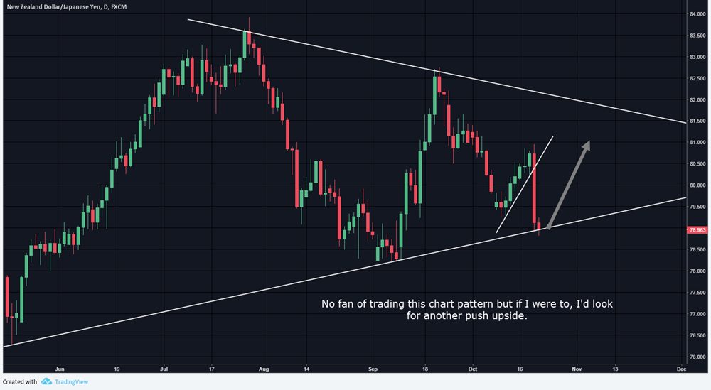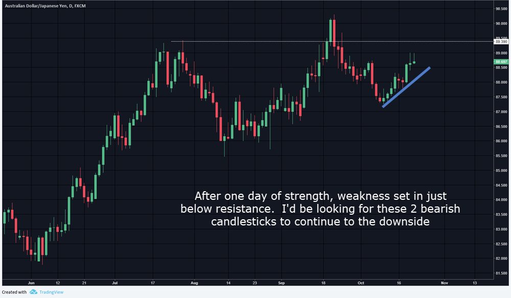 NZDJPY – Mentioned not a fan of those chart patterns and initially looking for another push long. Price matures during the week and as I have written many times before, know what a failure or successful hold of an area should look like. Price consolidated at lows which does not indicate strength. Reversal candlestick on Monday would have given you an entry below lows of 78.80 for a short trade of 90 pips.