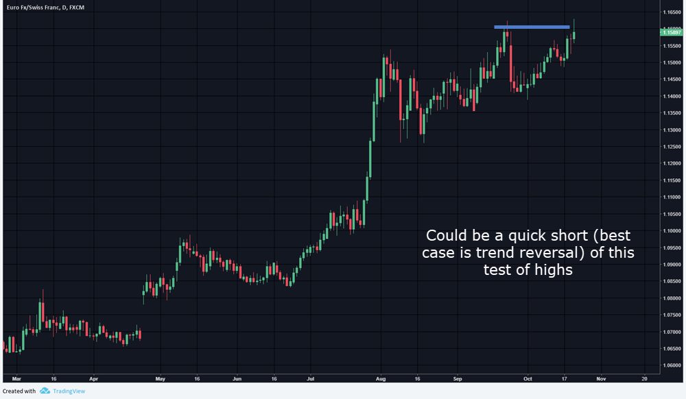 EURCHF – We were looking for a short trade off of these highs. First test was successful of highs which was really the weekly following through. The reversal happened with the engulfing candlestick for 60 pips. Not ideal.