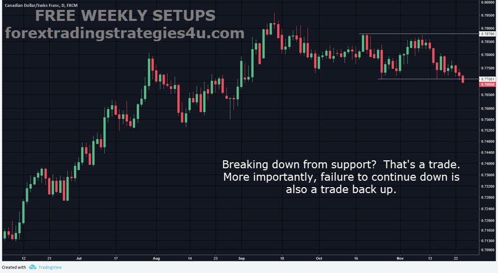 CADCHF – Support did break and even though price did follow through for a trade, there was no convincing short play on this break.