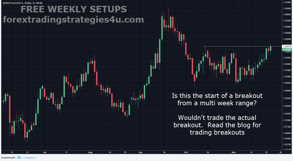 GBPUSD – Setup chart had indicated a breakout but not to trade the actual initial break. Price broke resistance, pulled back into the range and trade long is break of strong rejection candlestick on Nov 28 for 160 pips