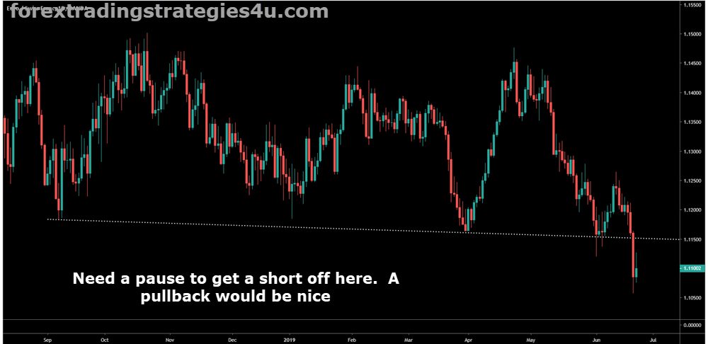 EURNZD – Price broke out and is currently in a pullback. Why not trade the breakout? Go over the many charts on our free forex setups and playing breakouts requires some type of basing. As well, when price runs from highs to lows (for a support break), we often see a pullback right after making the breakout play a low probability play