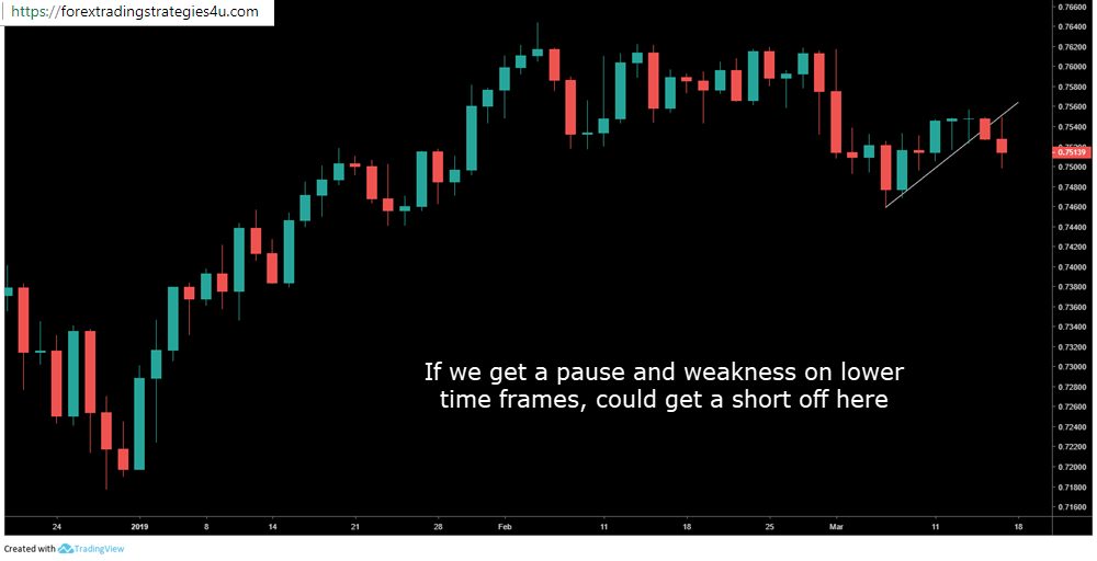 GBPJPY – As written, the initial thoughts were long depending on how this range resolved. We can see a poke above highs and rejection on March 13 which didn’t preclude longs. The four hour chart shows momentum to the downside breaking the support zone, a lazy pullback (this is our sign for shorts). Strong momentum in the pullback would negate any trade as it would have been back in the range. Price ranges, small test of highs on the 19th sets up trend line break entry for 328 pips. Yes, you could have shorted when price failed the highs (think 2B reversal) which gave an earlier entry.
